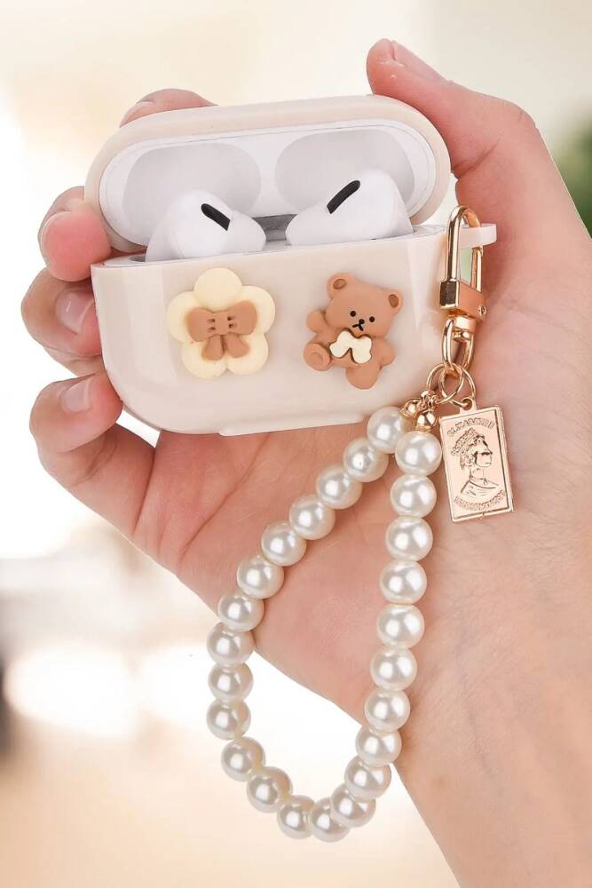 Airpods Pro 2. nesil uyumlu İnci Askılı Papyonlu Ayı Kulaklık Kılıfı