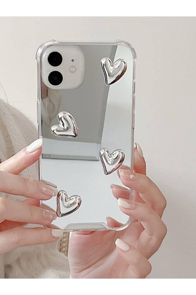İphone 12/12pro Uyumlu Aynalı Uyumlu Kılıf Gümüş Kalp Tasarımlı Şık Darbelere Karşı Dayanıklı Kapak
