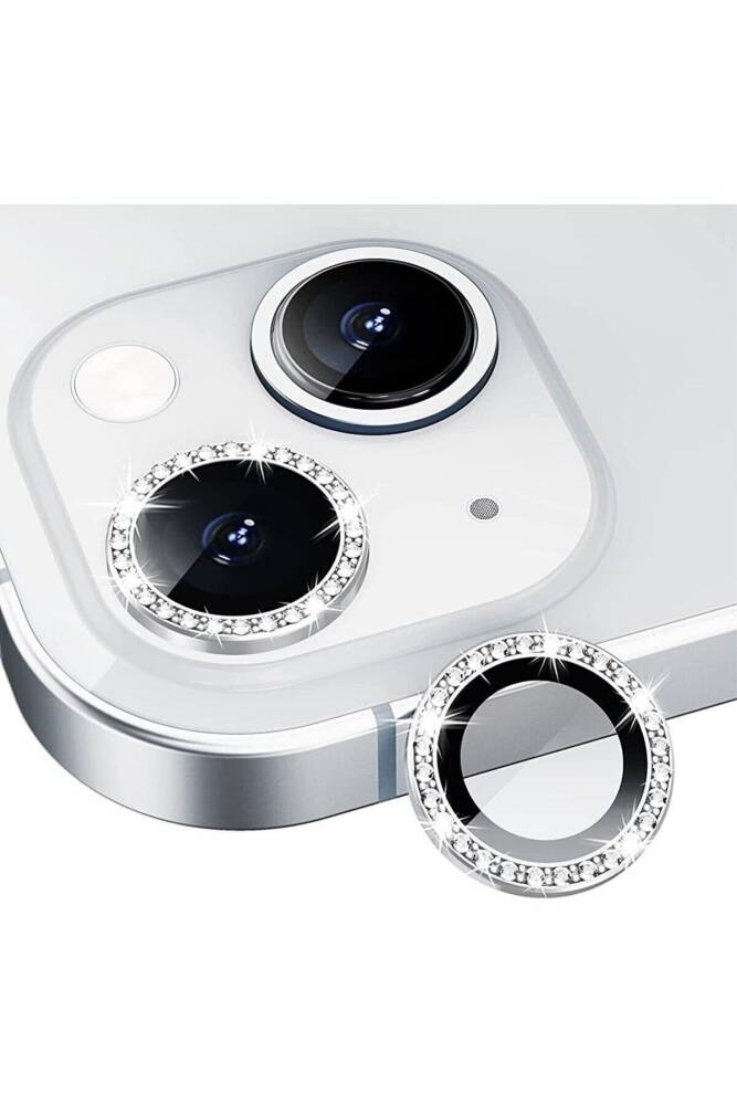 iPhone 15/15 Plus ve 14/14 Plus Kamera Koruma Taşlı Lens Koruyucu Temperli Gümüş
