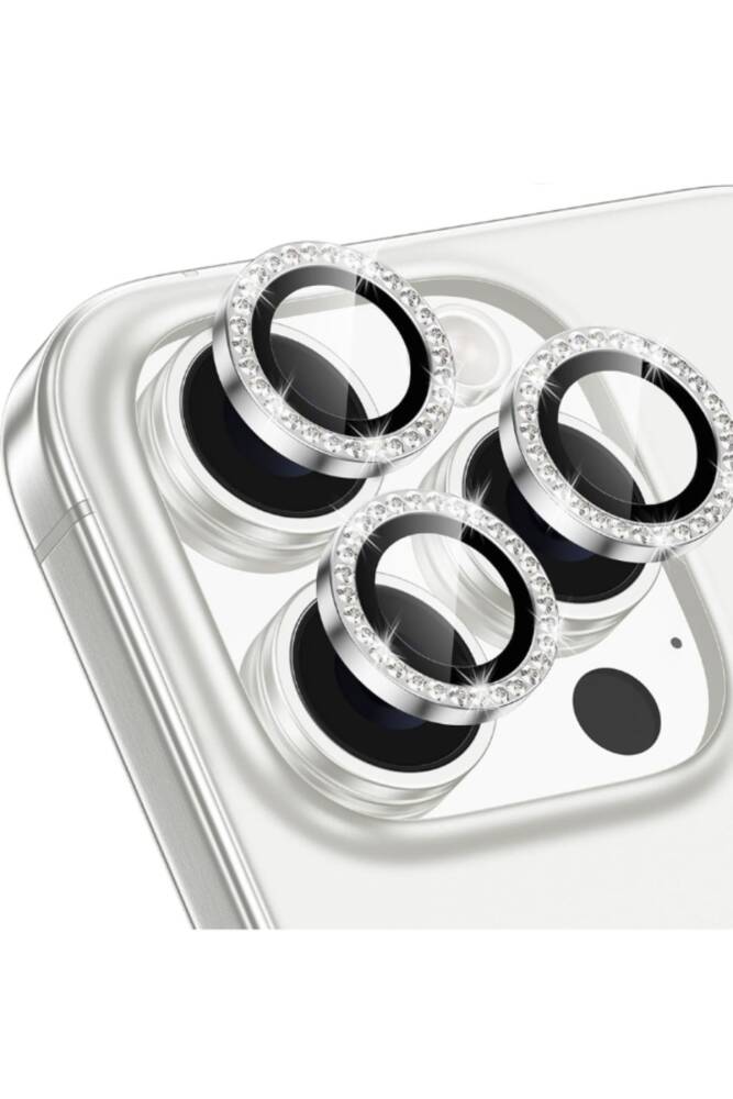 Iphone 16 Pro/16 Promax Uyumlu Kamera Koruma Taşlı Lens Koruyucu Temperli Cam Koruma Silver